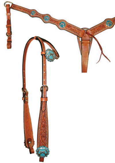 One-ear headstall with turquoise stingray rosettes, overlaid with silver crossed pistol conchos and silver spot trim. Stainless steel hardware with hand tooled floral. Hand tooled breast collar with turquoise stingray rosettes, overlaid with silver crossed pistol conchos and silver spot trim. Stainless steel hardware. Matches the KL Smokin guns Flex2 Shooter saddle, 0162-T0 Headstall and 4276-T0 Breast Collar. Color: Regular Oil