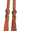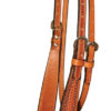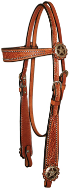 Tooled 5/8″ flared leather browband headstall with etched silver stars over brown iron conchos and silver spot trim. Matches the 2401 KL Quick Shot Mounted Shooter saddle.