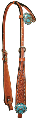 Tooled one ear headstall with silver crossed pistols conches, turquoise stingray print under conches, and silver spot trim. Stainless steel buckles. Matches the KL Smokin Guns Mounted shooter saddle.