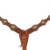 A nice compliment to the 2401 KL Quick Shot Mounted Shooting saddle. This floral tooled, scalloped breast collar is embellished with etched silver star over brown iron conchos. Color: Regular oil